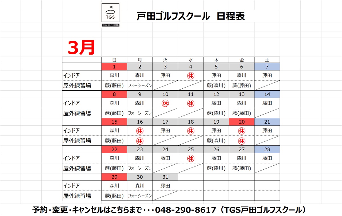 【3月】レッスンスケジュール(インドア・蕨バーディー・フォーシーズンズゴルフガーデン)