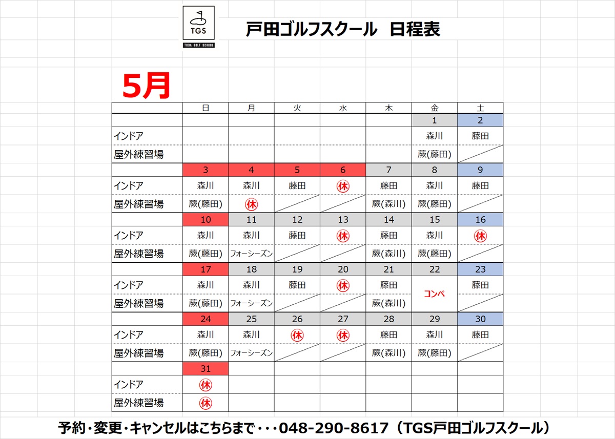 【5月】レッスンスケジュール(インドア・蕨バーディー・フォーシーズンズゴルフガーデン)